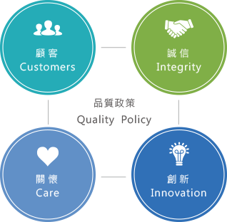 以「顧客第一、品質至上、服務創新」的理念,提供客戶一流之產品及服務品質。